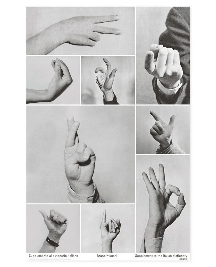 Inspired by supplemento al dizionario italiano (Supplement to Italian dictionary) this poster is a collection of some of the most famous pictures of hands realized by Bruno Munari. He created with them a sort of visual Italian dictionary with explanations for each gesture, so that "the documentation is as precise as possible. It is an ideal supplement to the Italian dictionary for use by foreign visitors"